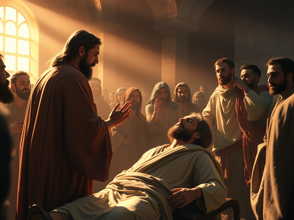 El paralítico es llevado por cuatro hombres que, ante la imposibilidad de acceso, innovan y rompen barreras físicas (el techo) para llevarlo a Jesús. Esto refleja el principio de la solidaridad y el bien común. La DSI enseña que la sociedad debe organizarse de modo que todos, especialmente los más frágiles o con movilidad reducida, puedan participar plenamente y acceder a lo necesario para su desarrollo. La acción del grupo muestra que la fe se traduce en obras que superan obstáculos injustos. - Sanación integral: reconciliación y reinserción social: