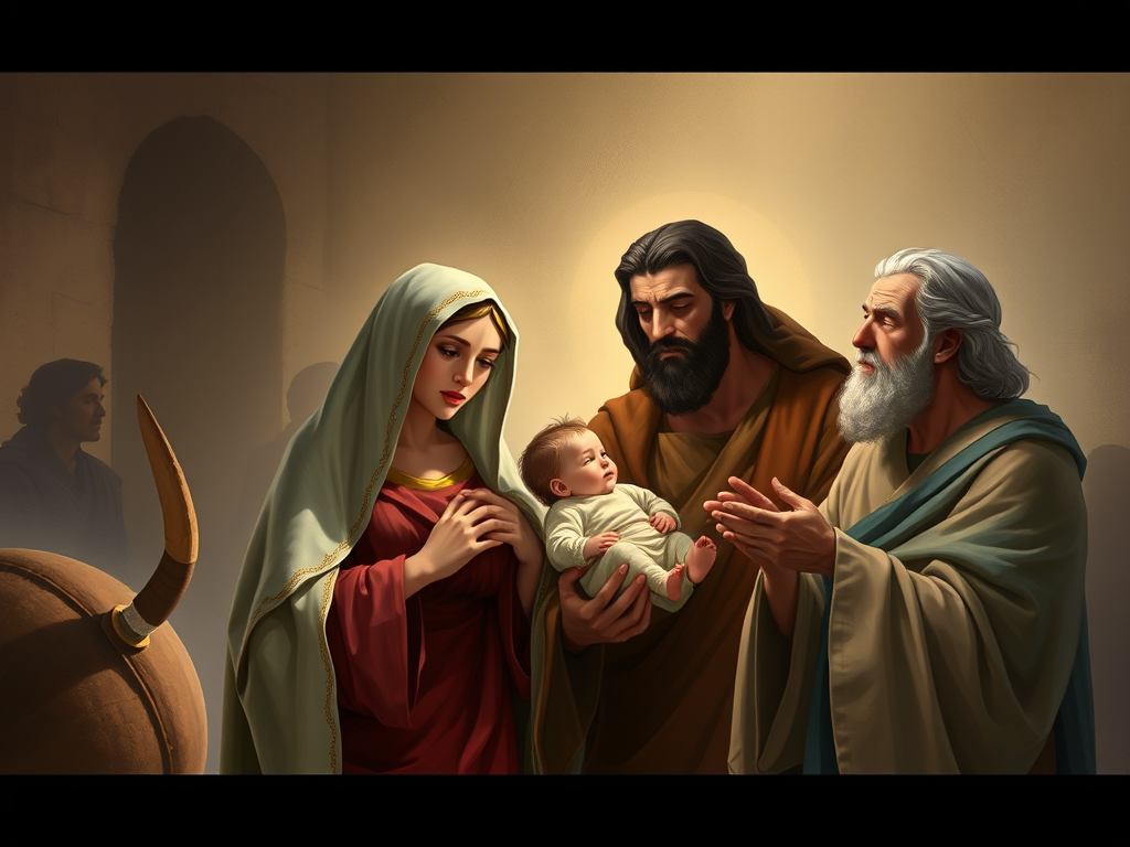 José y María llevan a Jesús al Templo de Jerusalén para presentarlo al Señor, conforme a la Ley de Moisés. Allí encuentran a Simeón, un hombre justo y piadoso, que había recibido la promesa del Espíritu Santo de que no moriría sin ver al Mesías. Simeón toma al niño en brazos y pronuncia un cántico de acción de gracias (el Nunc Dimittis). Luego bendice a la pareja y dirige a María estas palabras: “Mira, este niño está puesto para caída y elevación de muchos en Israel, y para ser señal de contradicción —y a ti misma una espada te atravesará el alma—, para que queden al descubierto las intenciones de muchos corazones” (vv. 34-35).